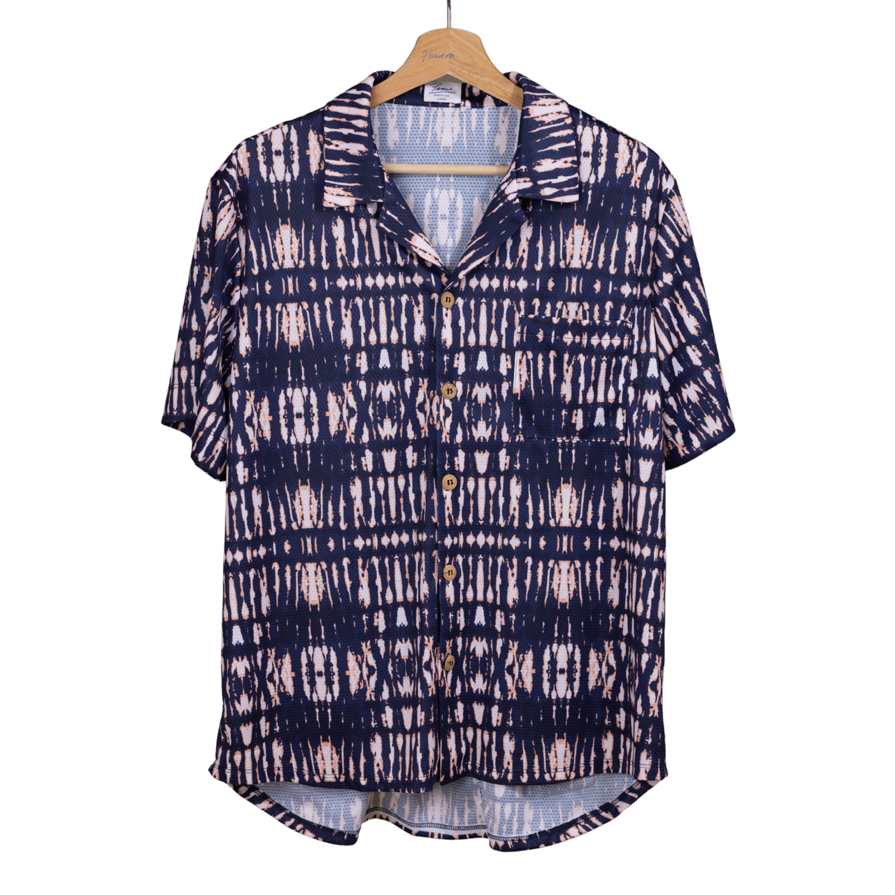 The Iwi gravel Shirt is a blend of deep navy and crisp white, featuring an abstract design that invites imagination. Its intriguing patterns shift with perception, making each glance a new discovery. A perfect choice for those who appreciate mystery and creativity in their style.